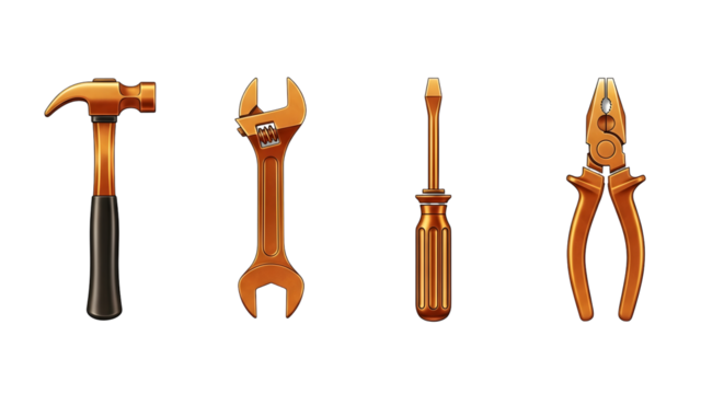 Four golden metallic tools, hammer, adjustable wrench, screwdriver, and pliers, arranged in a line against a transparent background, symbolizing craftsmanship and repair.