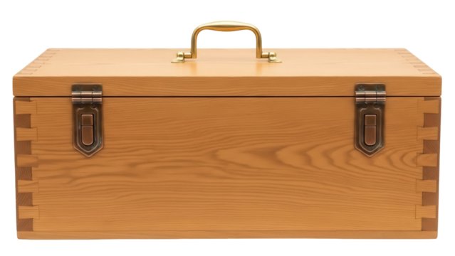 Wooden toolbox with metal handle isolated PNG, vintage storage container for tools and equipment on transparent background