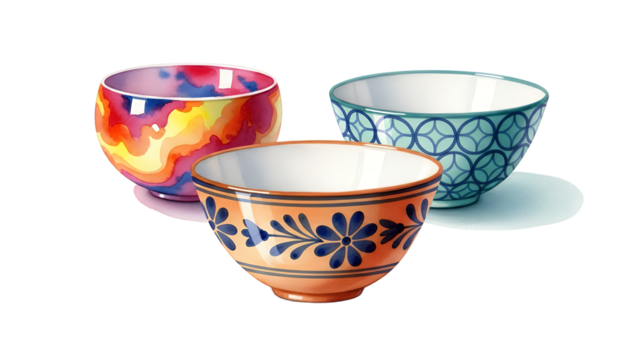 Handmade pottery bowls with vibrant designs and patterns on a white background from a front viewpoint