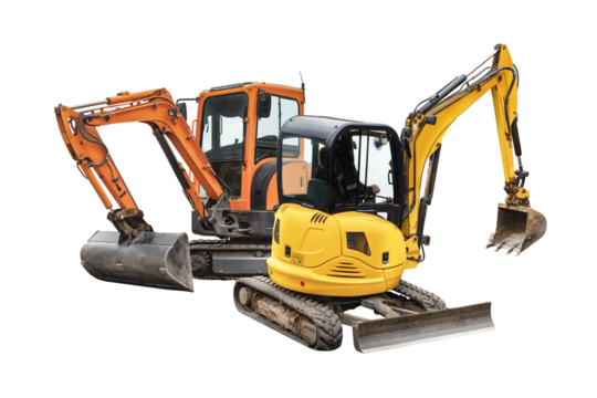 Mini excavators excavator isolated on white background. Construction equipment for earthworks in cramped conditions. Rental of construction equipment.