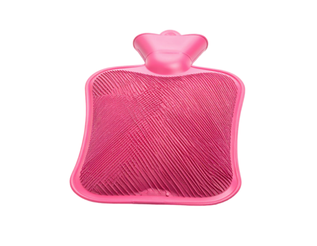 A pink, rubbery, textured hot water bottle with a curved neck and a black background