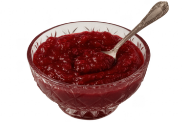 Crystal bowl with cranberry sauce and silver spoon on transparent background