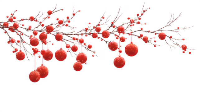 A vector illustration of a horizontal Christmas branch border with red ornaments, styled with clean, modern lines. EPS 10 graphic, isolated on white background.