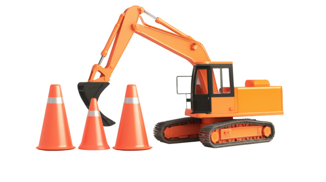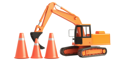 An orange excavator with a bucket arm positioned near three orange traffic cones.