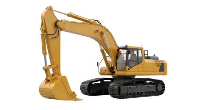 Yellow excavator with bucket and tracks isolated on transparent background