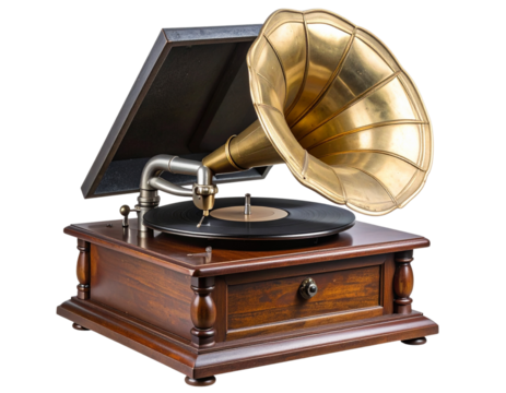 Close-up of Old Gramophone Turntable and Crank Handle, isolated on a transparent background