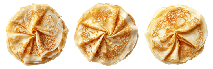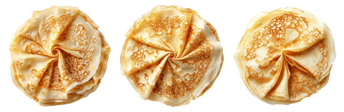 Stack of folded golden crepes arranged in a circular swirl pattern, isolated on white transparent background