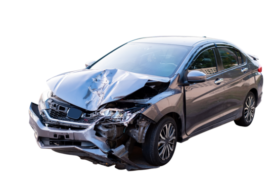 Front of white car get damaged by accident on the road. damaged cars after collision. isolated on transparent background, PNG file