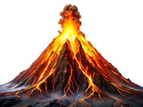 Volcano erupting with lava flowing down the mountain isolated on transparent background