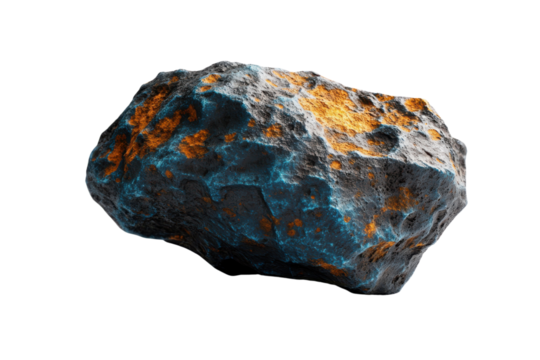 High-resolution image of a textured meteorite or space rock with a combination of dark, orange, and blue hues on a white background.