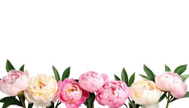 Floral border of pink, white and cream peonies, leaves and black background create a soft, delicate arrangement
