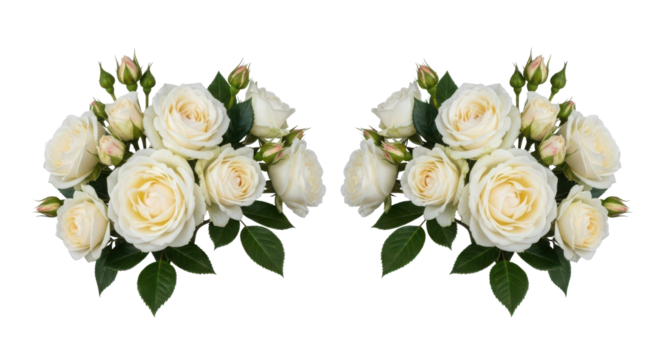 Elegant twin bouquets of delicate white garden roses and green leaves for greeting cards isolated PNG with Transparent Background