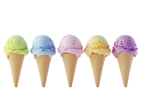 Colorful ice cream cones in vibrant flavors isolated on transparent background