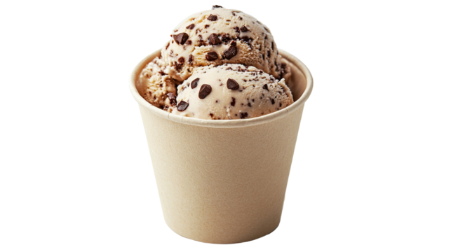 Delicious vanilla ice cream with chocolate chips in a yellow polka dot cup isolated on transparent background