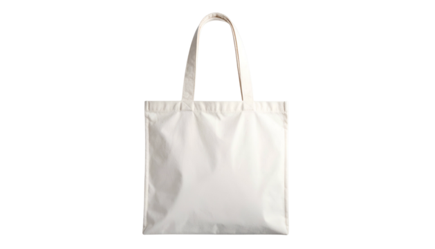 A reusable cream-colored tote bag with sturdy, white handles stands upright against a dark contrasting background.