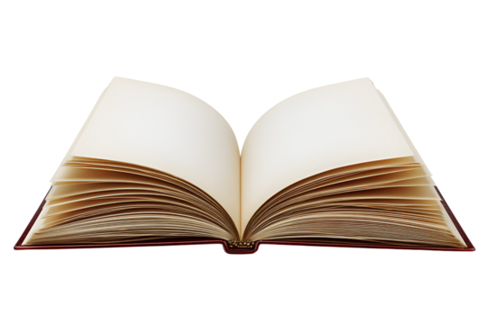 Brown leather-bound journal with cream pages on transparent background