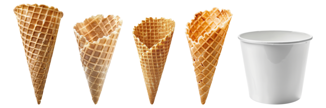 Set of empty ice cream cones and cup isolated on a transparent background for menu, poster or recipe design.