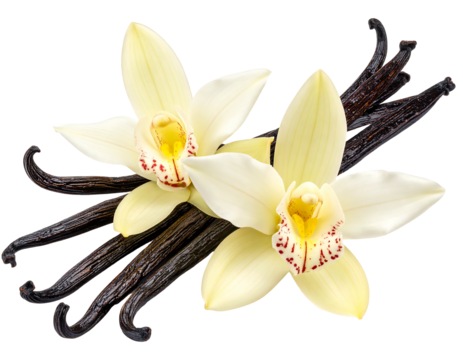 Two pale yellow orchids rest atop dark brown vanilla pods