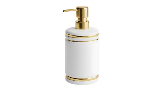 White ceramic soap dispenser with gold trim isolated on transparent background