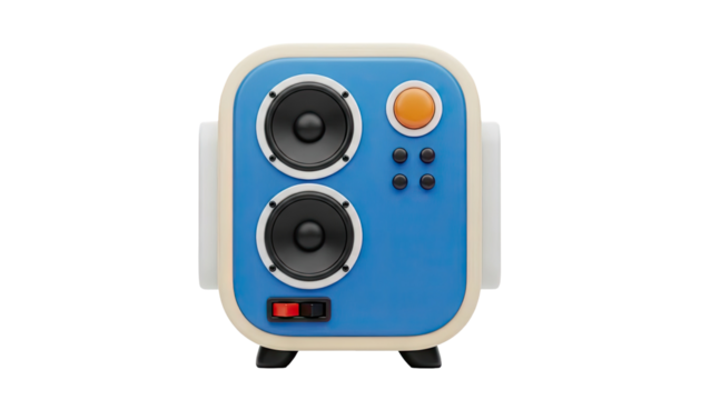 3D Retro blue speaker with cream trim and orange button on transparent background