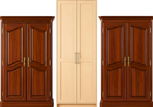 Two brown wooden cabinets with doors and a cream panel isolated on transparent background
