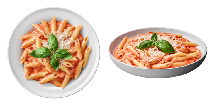 Penne alla Vodka pasta in a pink tomato cream sauce with parmesan and basil isolated on transparent background, pasta dish bundle