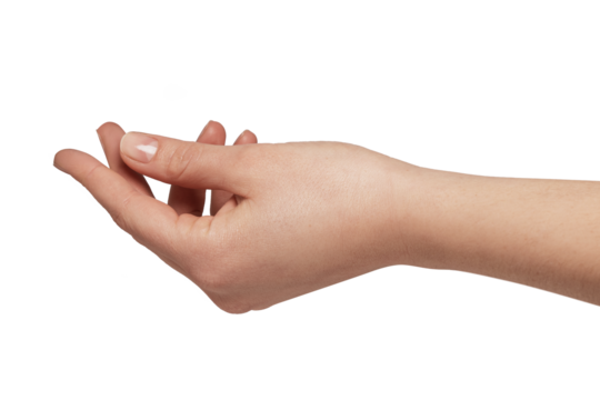 Woman hand with palm facing upwards extends, creating empty space for holding, receiving, or presenting an object, concept, or text on a clean background