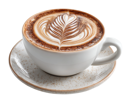 A cup of cappuccino isolated on transparent background, adorned with latte art and surrounded by roasted coffee beans, creating a warm and inviting ambiance for coffee lovers everywhere