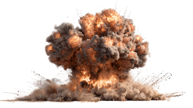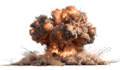 Fiery explosion creating a large mushroom cloud of dark smoke and intense flames, with debris and dust scattering from the powerful ground detonation on a transparent background, png