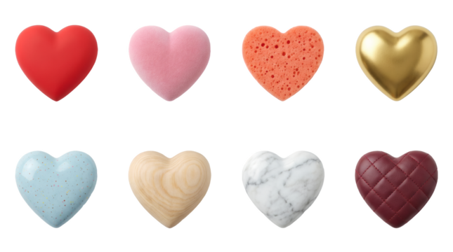 Heart shape set including red matte, pink velvet, sponge, gold, ceramic, wood, marble, and leather textures. Symbol of love and valentine collection.