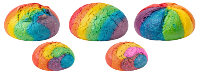 Five colorful, rainbow-iced buns are displayed on a white background. These treats might be found in a bakery, adding a touch of whimsy.