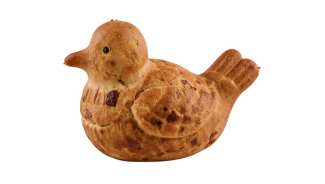 Homemade bird shaped bread isolated on the transparent background, creative baked goods, fun animal shaped pastry for festivals and childrens parties