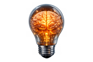 Photo of brain inside a light bulb glowing isolated on transparent background
