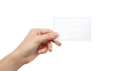 A hand presenting a blank white card ideal for mockups on transparent background.