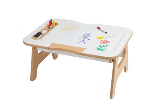 Wooden children s drawing and activity table with art supplies isolated on transparent background