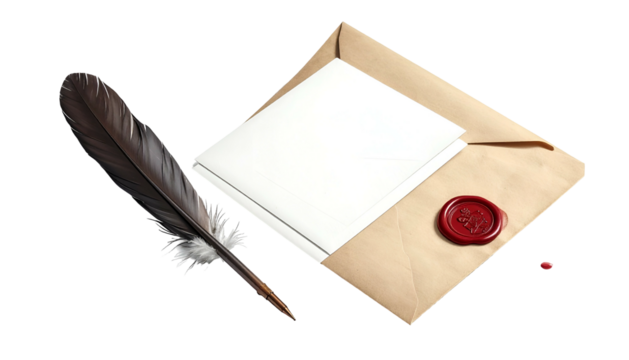 An opened envelope with blank paper, a feather quill, and a red wax seal on a black background