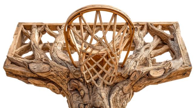 Wooden basketball hoop tree trunk backboard carved wood net nature sports fusion rustic design fantasy sculpture surreal artwork outdoor court concept eco art organic texture, isolated