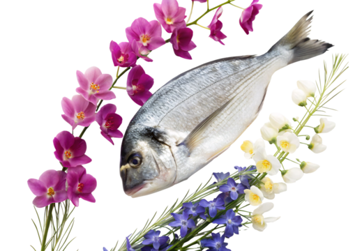 Sea bream fish flowers arrangement, fresh seafood purple orchids white blooms decoration, isolated on a transparent background