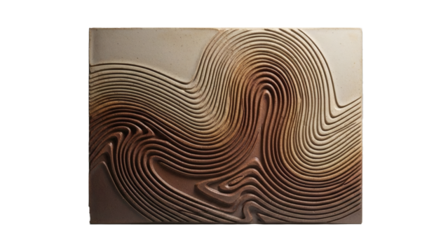 A textured metallic surface with intricate, swirling, wave-like engraved lines in warm tones, set against a dark background.