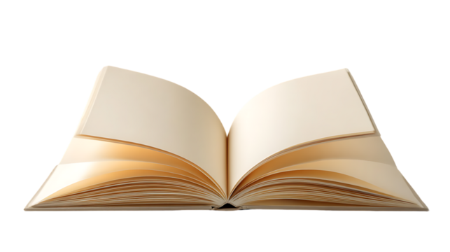 Illustration of an open book with blank pages, isolated on transparent background the image represents knowledge, education, reading, and learning
