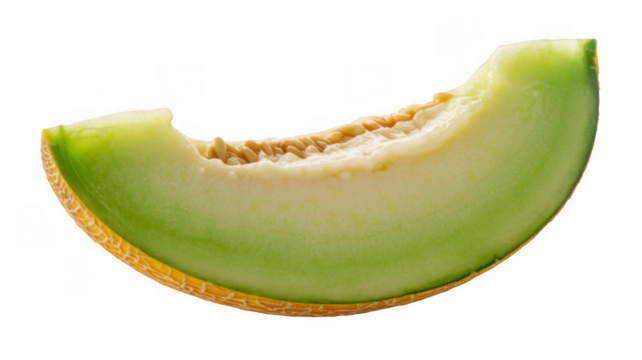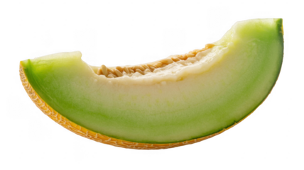 Green melon slice with yellow rind and seeds isolated on a transparent background