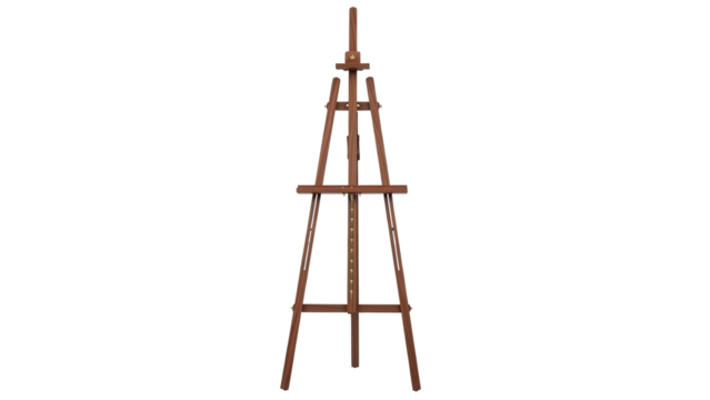 Brown wooden artist easel for painting stands upright, cut out, stock png, isolated on transparent background
