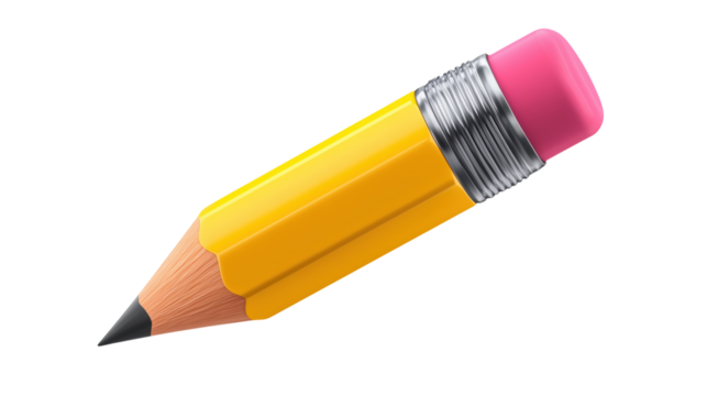 Yellow 3D pencil with pink eraser for education and creative writing design concepts.