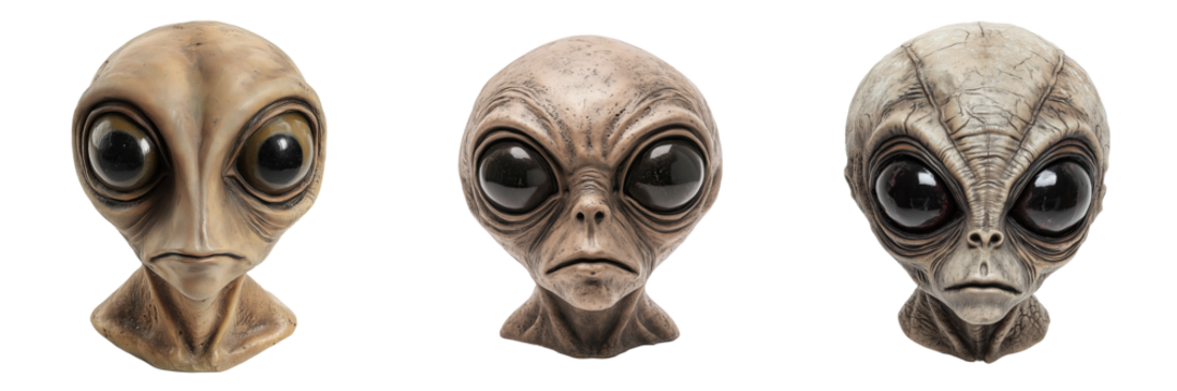 Set of alien head sculpture with large eyes isolated on a transparent background