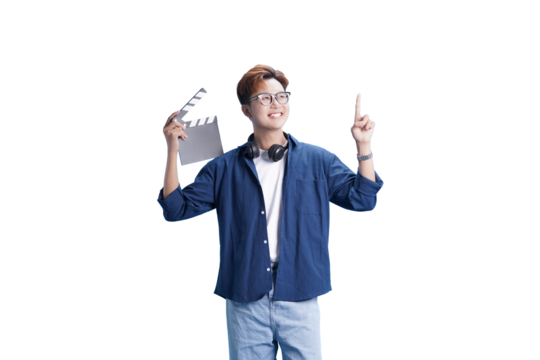 Lights, Camera, Action: A content creator holds a clapperboard and points upward, filled with creativity, enthusiasm, and vision, ready to capture the magic of the moment.