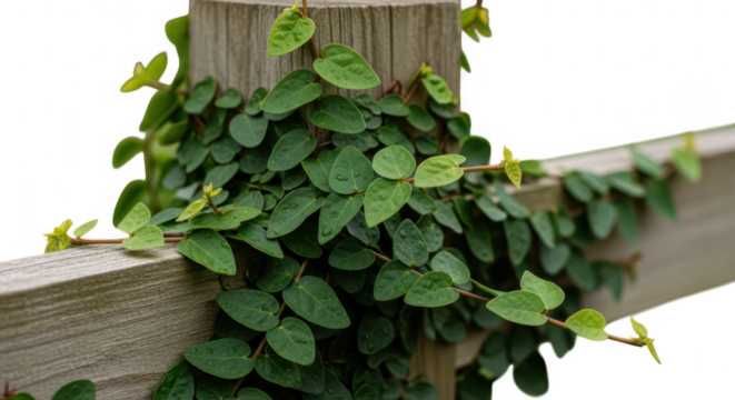 Creeping fig vine growing on a wooden post and railing isolated on transparent background