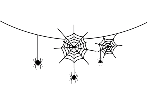 Spooky spiderwebs with hanging spiders create eerie Halloween atmosphere for holiday decorations and party themes