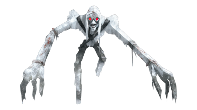 Eerie, gaunt figure with glowing red eyes, reaching out