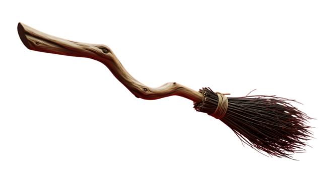 Rustic wooden witch's broomstick with natural twig bristles, perfect for Halloween or fantasy themes