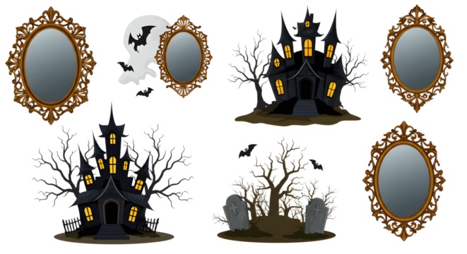 Top view of a rectangular picture frame with creepy Halloween decorations like spiders bats and cracked bones designed in a distressed black finish isolated on white background See Less